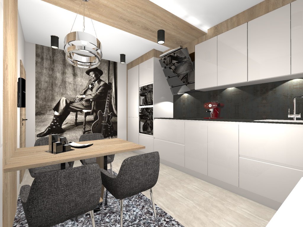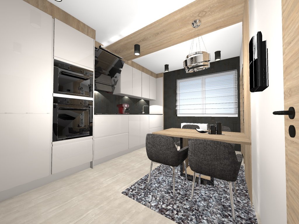 A második változatban egy kisebb kanapé is helyet kapott itt. A lakás szíve a konyha! Miért ne lehetne több is ennél!?