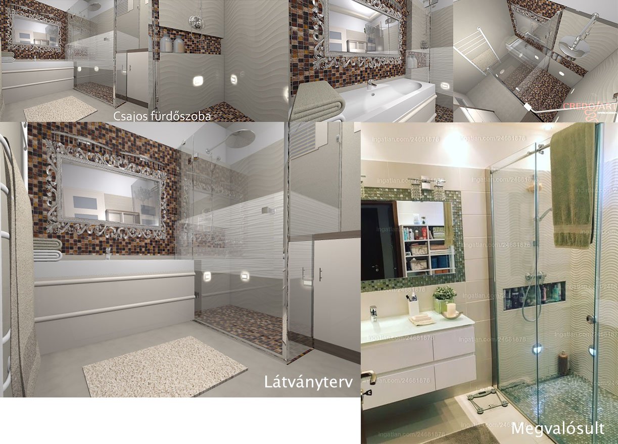 Itt látható a jó példa, amikor a tervezett bronz mozaikot időközben már nem lehet rendelni. Gyors egyeztetés, minták beszerzése, kis bolti hercehurca, aztán a kiválasztott új anyag kerül a falra. Ettől még ugyanúgy gyönyörűséges az egész, és minden más változatlanul készült el! Épített zuhany, fülkés pakolóval. A tolóajtós zuhanyajtó szintén egyedi és egy jó kezű üveges műhely keze munkáját dícséri. http://www.uvegfarm.hu/