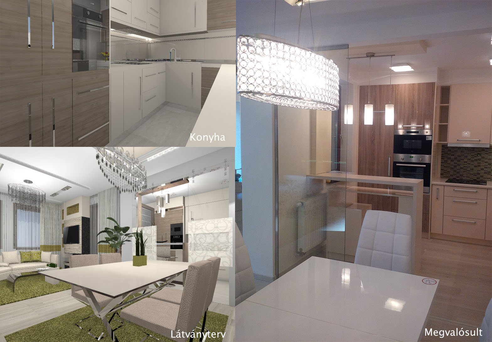 Konyha étkező, minden terv szerint! A térelválasztó üvegfal mintája az étkező falán látható tapéta mintájával mart. Olyan egyszerű , szinte láthatatlan dolgok ezek, de a tervezettség, és a kis apró összefésült részletek hozzák a valódiságot a térbe.