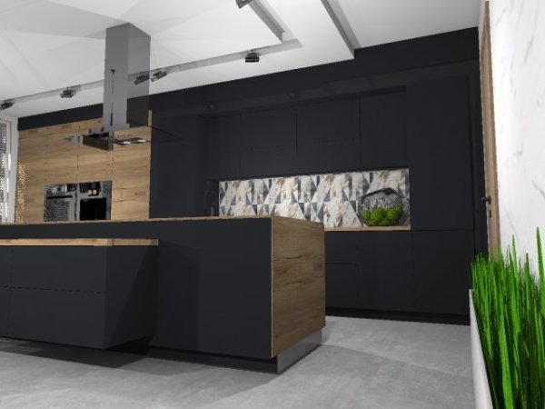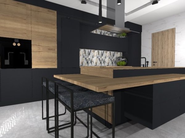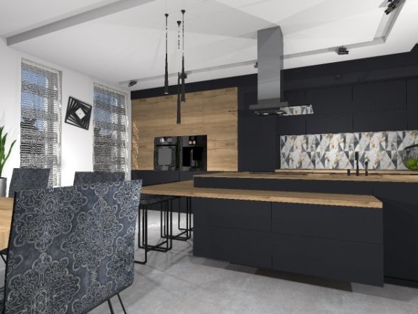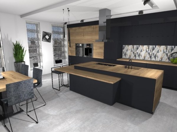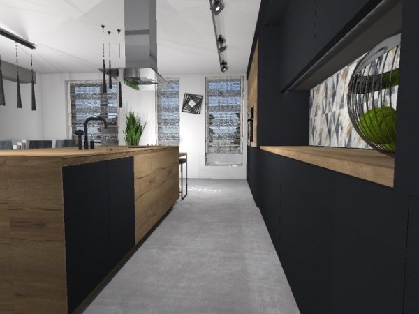 Külső jegyeiben is Industrial jellegű családi ház prémium megjelenésű belsőt kíván. Ennek fényében terveztem meg az első és talán legfontosabb helyiséget a konyhát- étkezőt.